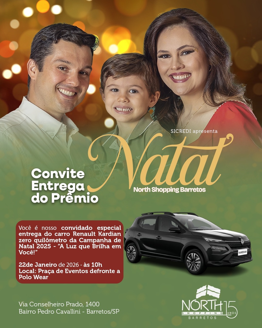 O North Shopping Barretos realiza nesta quinta-feira, 22 de janeiro, 10h, a entrega do carro Renault Kardian zero quilômetro, prêmio principal da Campanha de Natal 2025, “A Luz que Brilha em Você!”, ao ganhador Carlos Donizeti Pacífico,...